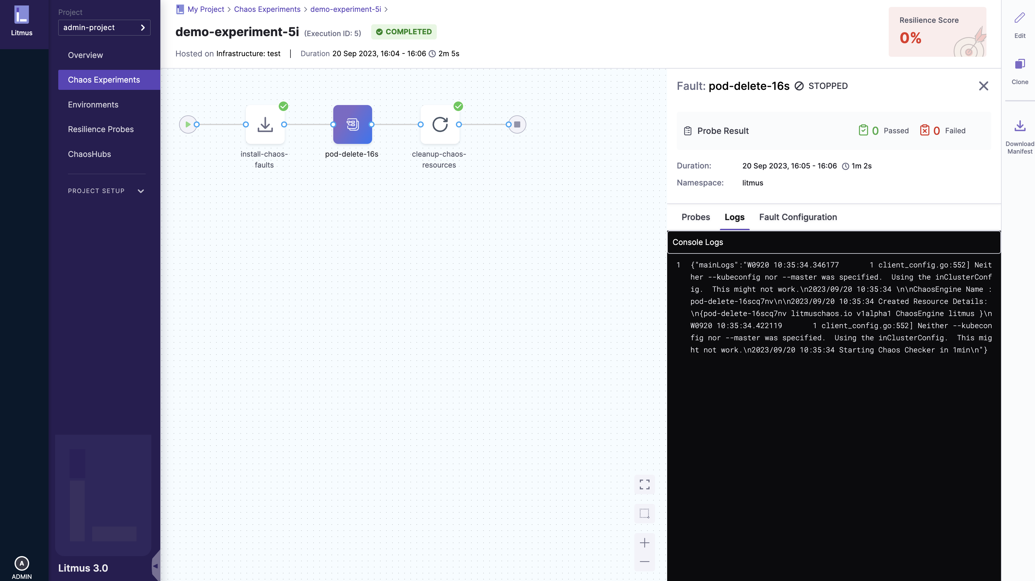 After scheduling a chaos experiment, a user can view the details of the running chaos experiment from the ChaosCenter. ChaosCenter provides a real-time graph that is used to visualize the chaos experiment and get the details of individual steps of the chaos experiment. Important details like the logs and target applications can be viewed from ChaosCenter. Once the chaos experiment execution is completed, the resiliency score is calculated and the ChaosResult for the ChaosEngine pods is available.